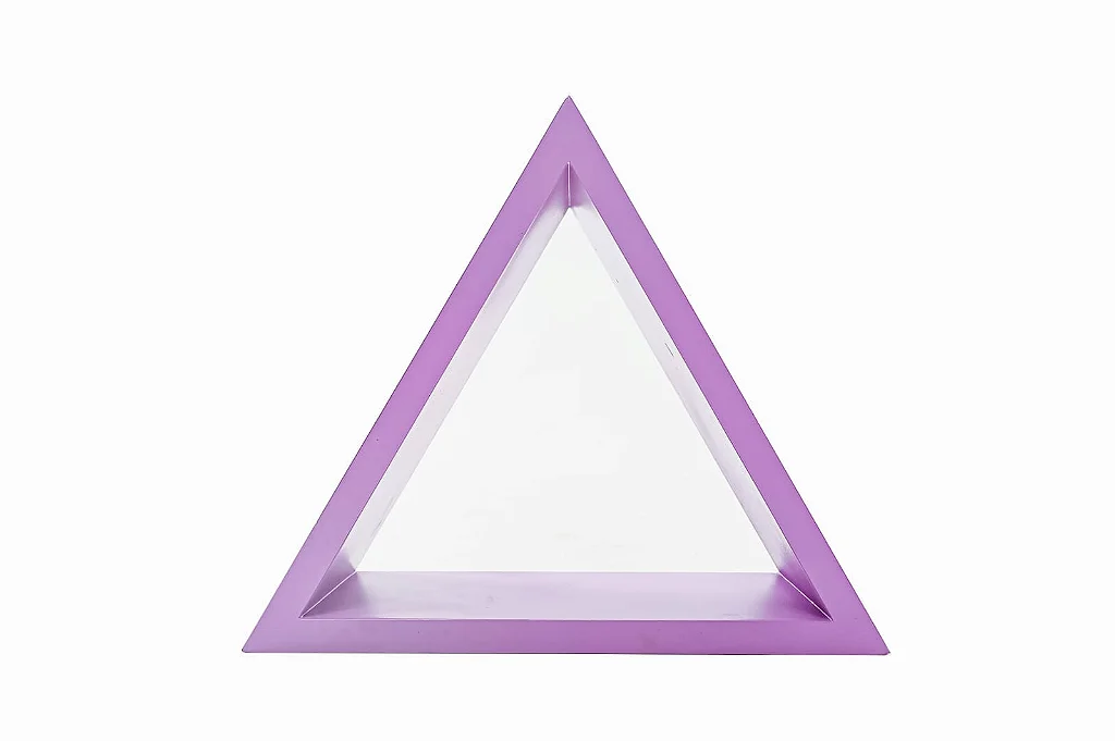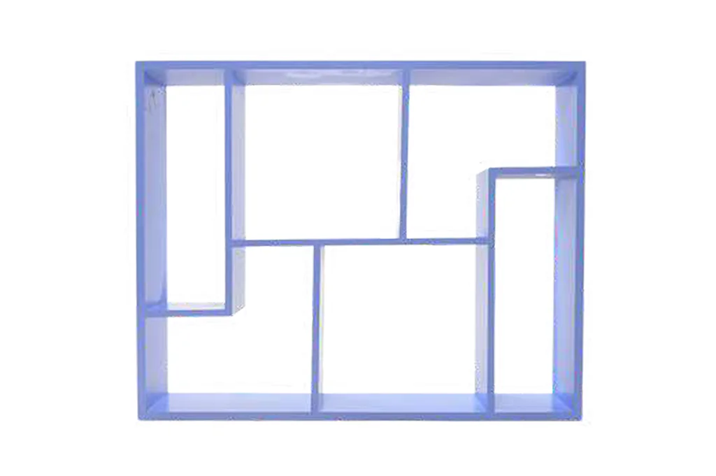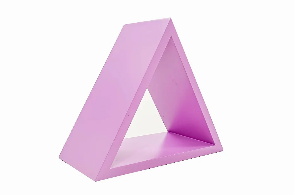 Nicho com três lados, disponível em branco e mirtilo, ideal para organizar objetos em diferentes ambientes.
